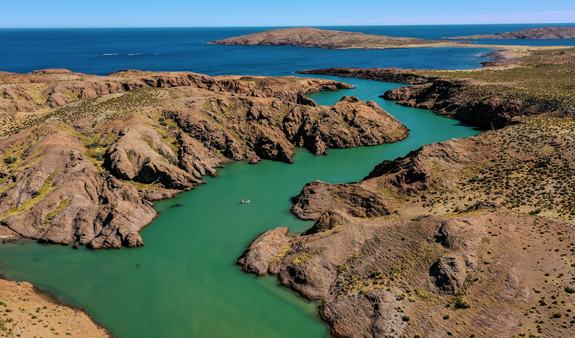 Por Bahía Camarones rumbo a Islas Blancas, con observación de colonias de lobos marinos, cormoranes imperiales y una gran diversidad de aves marinas. Durante la navegación es posible ver toninas, delfines australes, ballenas jorobadas y ballenas sei.